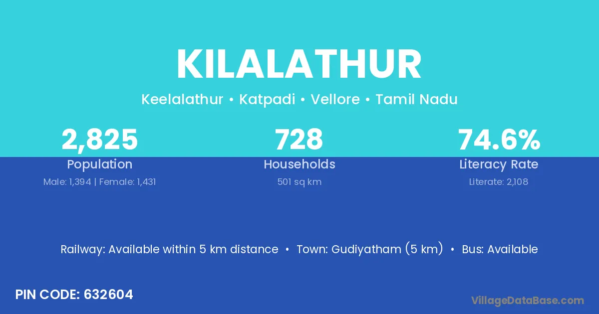 Gudiyatham (5 km) is the nearest town to Kilalathur village for major economic activities and is located approximately 5 km away.