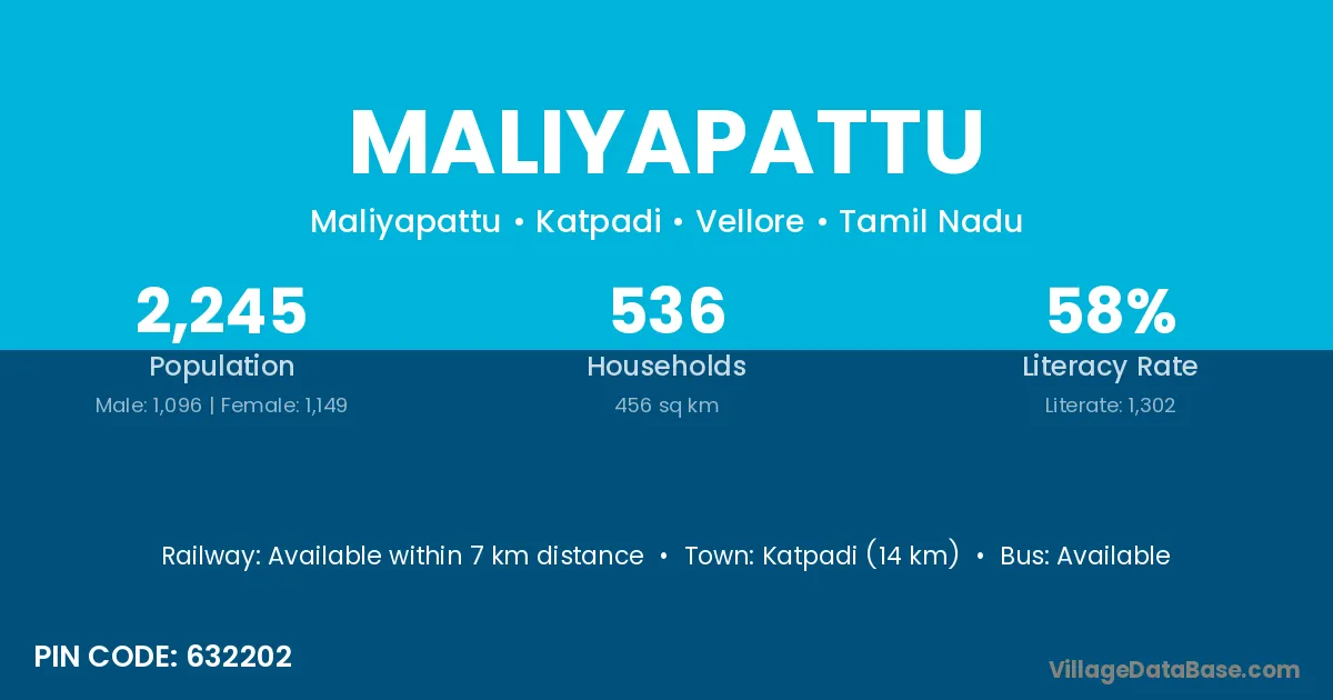 Katpadi (14 km) is the nearest town to Maliyapattu village for major economic activities and is located approximately 14 km away.