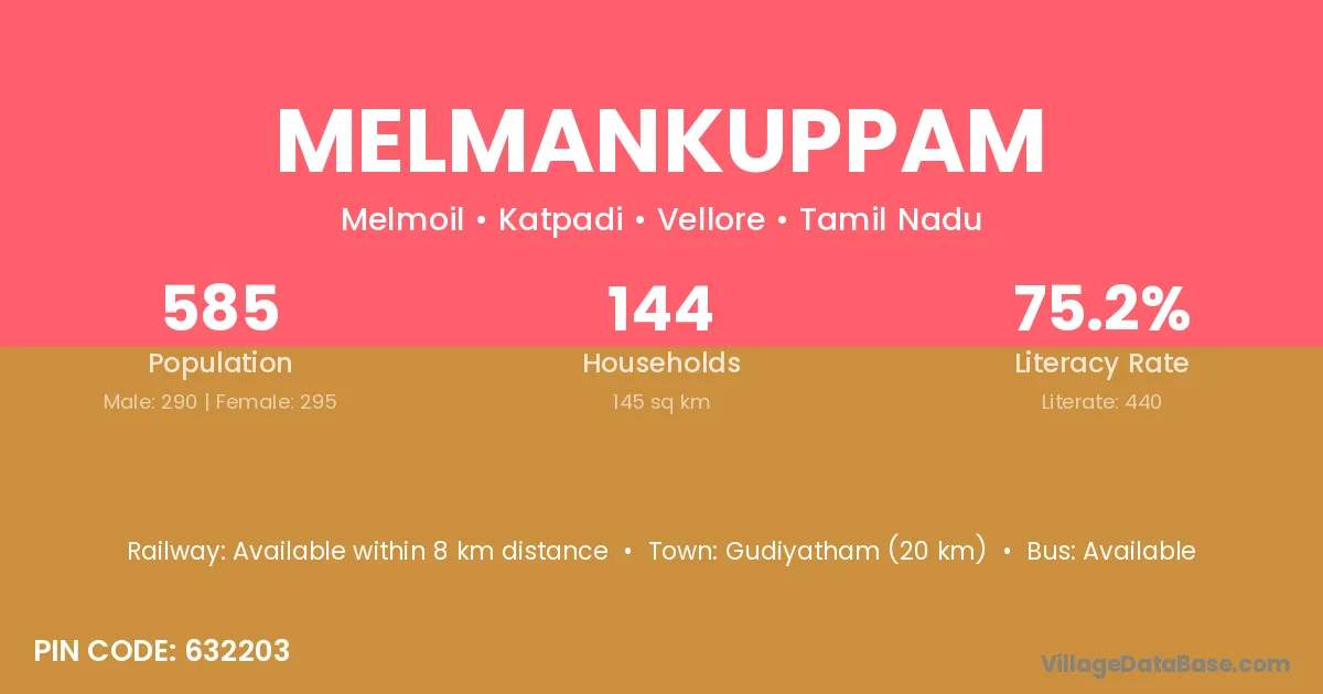 Melmankuppam village has a total population of 585 people, of which 290 are males and 295 are females.