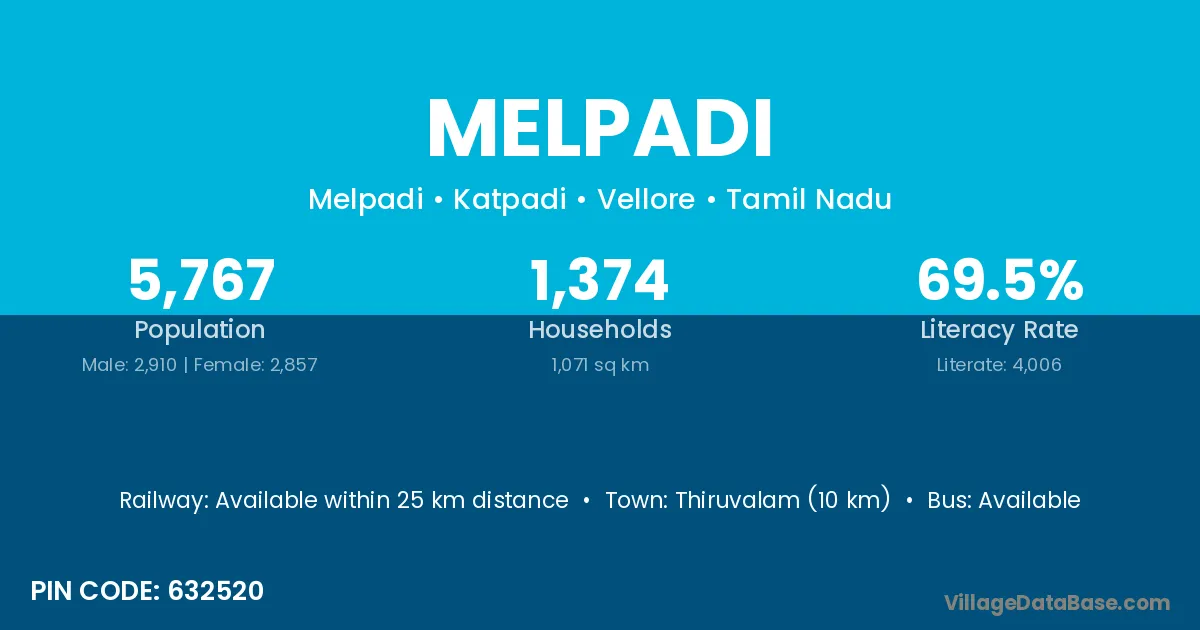 Thiruvalam (10 km) is the nearest town to Melpadi village for major economic activities and is located approximately 10 km away.