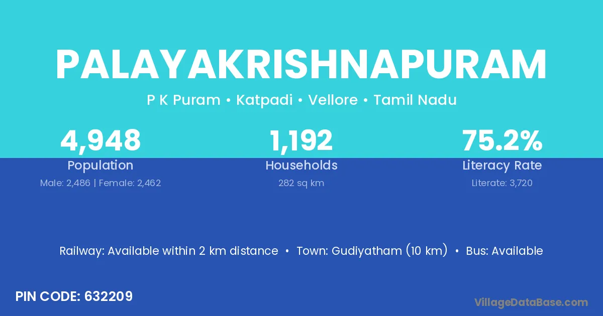 Gudiyatham (10 km) is the nearest town to Palayakrishnapuram village for major economic activities and is located approximately 10 km away.