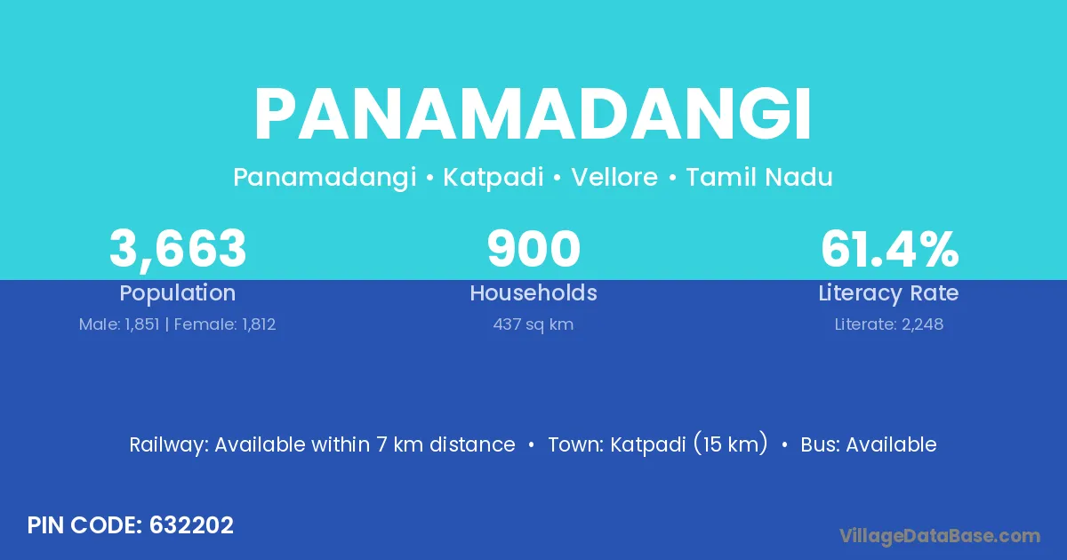 Katpadi (15 km) is the nearest town to Panamadangi village for major economic activities and is located approximately 15 km away.