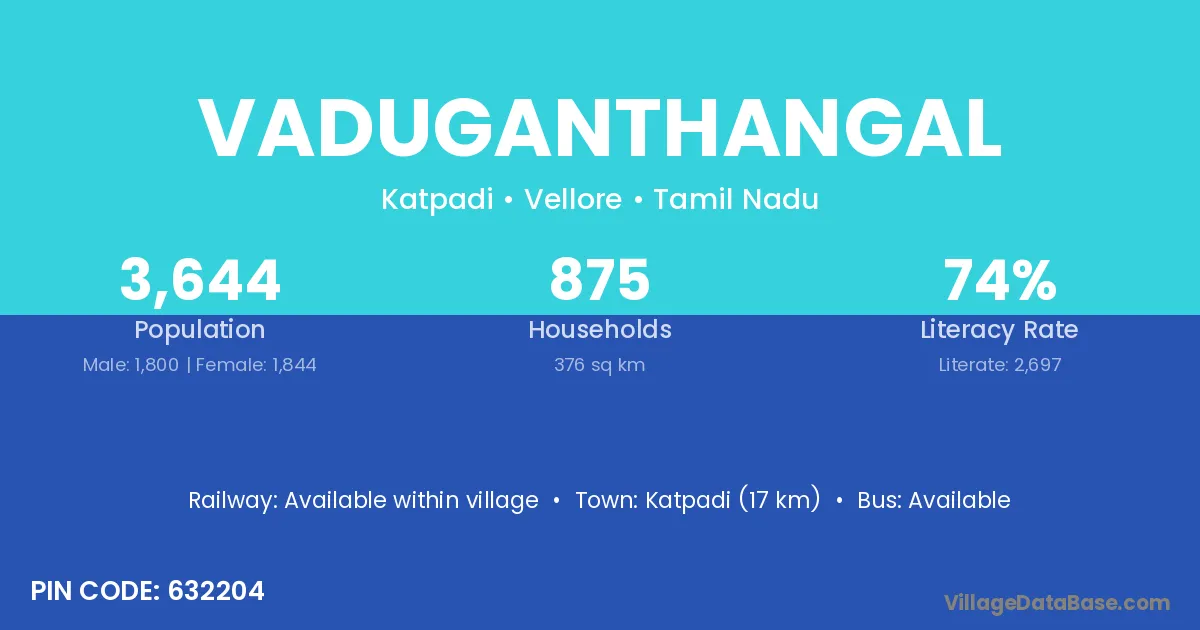 Katpadi (17 km) is the nearest town to Vaduganthangal village for major economic activities and is located approximately 17 km away.