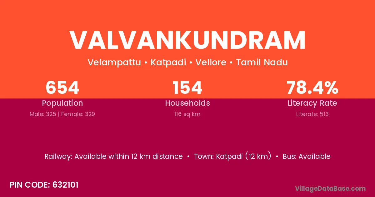 Katpadi (12 km) is the nearest town to Valvankundram village for major economic activities and is located approximately 12 km away.