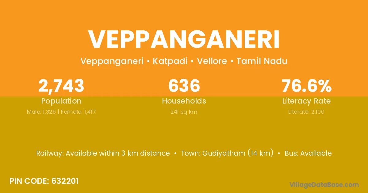 Gudiyatham (14 km) is the nearest town to Veppanganeri village for major economic activities and is located approximately 14 km away.