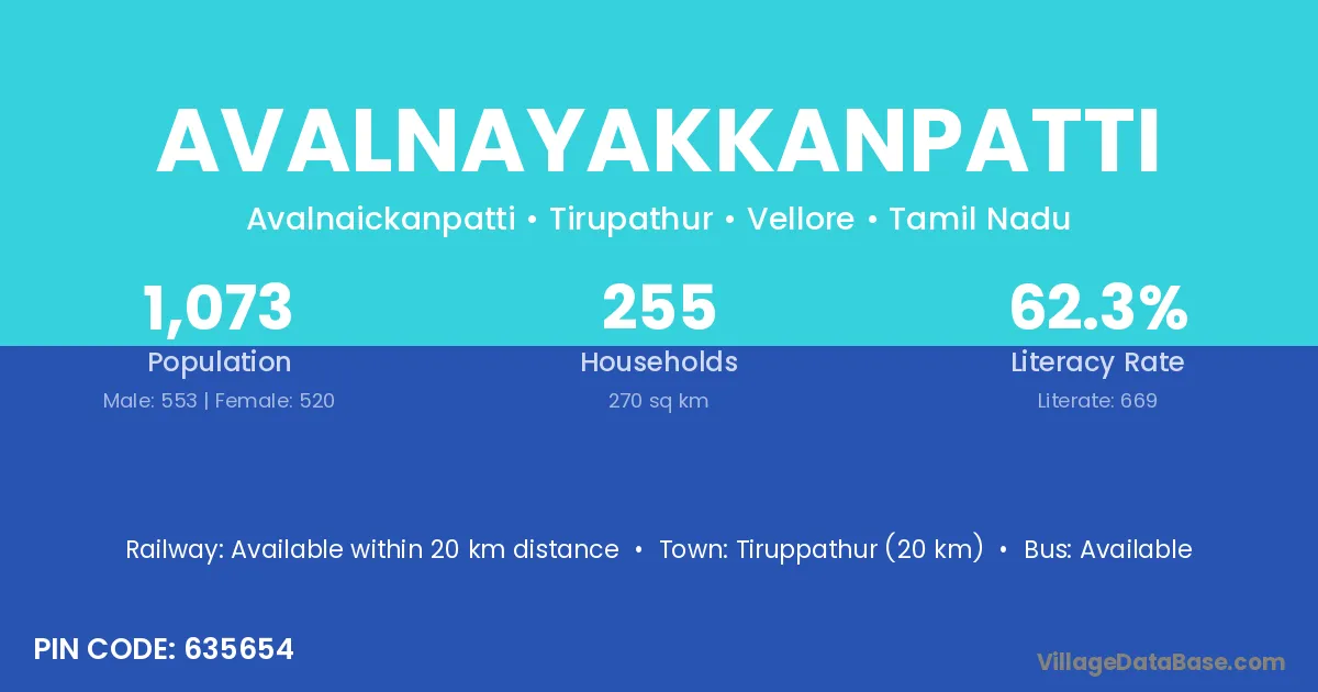 Tiruppathur (20 km) is the nearest town to Avalnayakkanpatti village for major economic activities and is located approximately 20 km away.