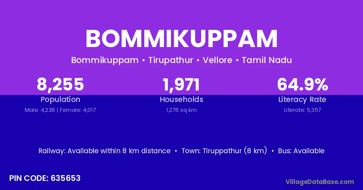 Tiruppathur (8 km) is the nearest town to Bommikuppam village for major economic activities and is located approximately 8 km away.