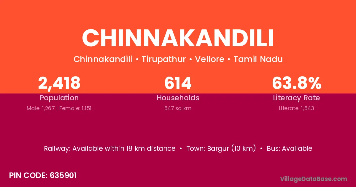 Bargur (10 km) is the nearest town to Chinnakandili village for major economic activities and is located approximately 10 km away.
