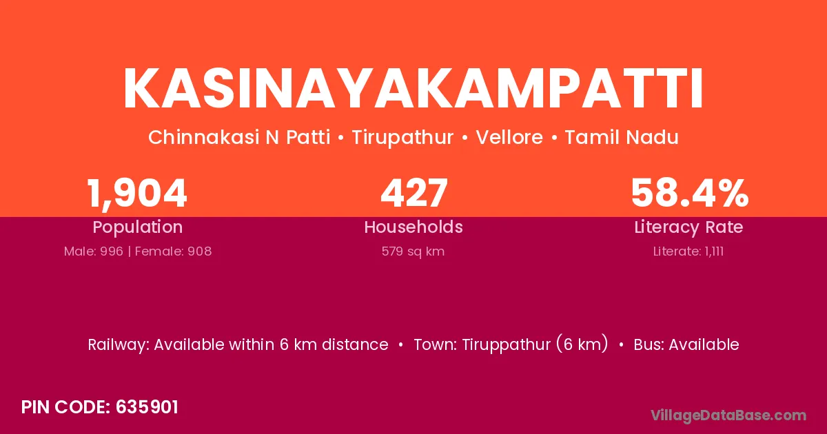 Tiruppathur (6 km) is the nearest town to Kasinayakampatti village for major economic activities and is located approximately 6 km away.