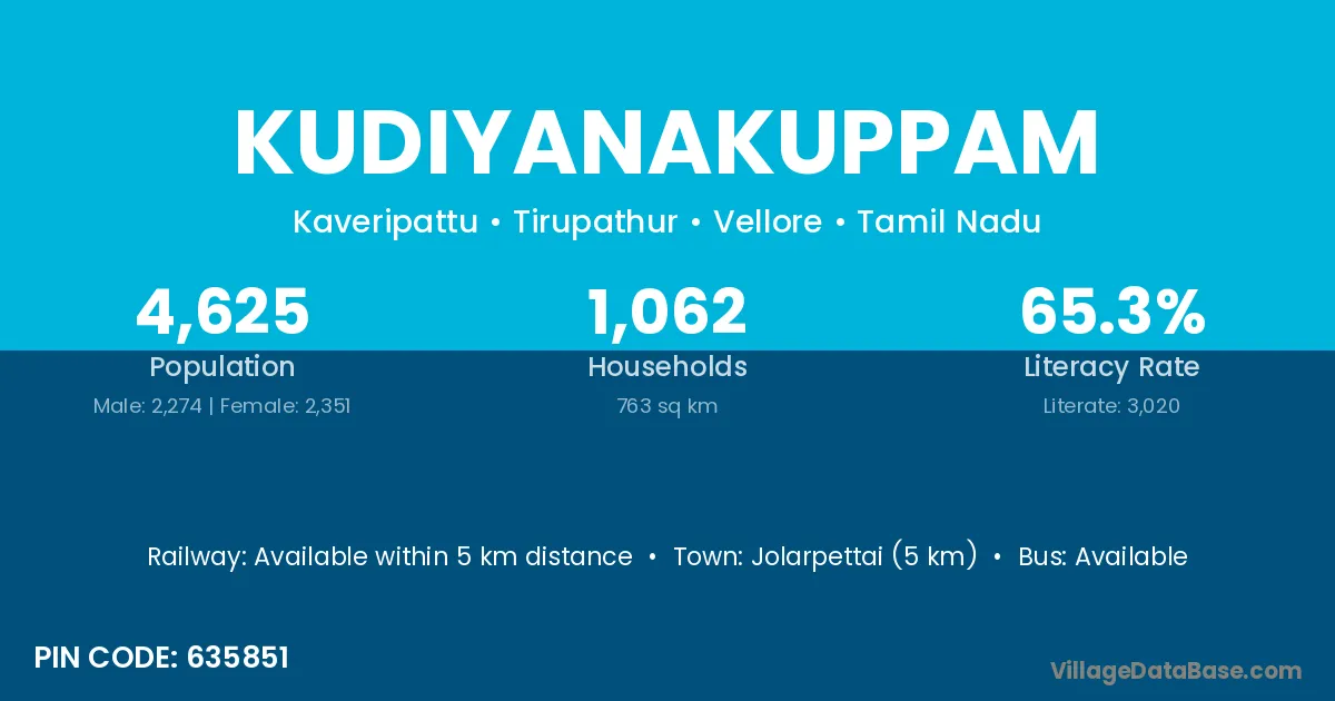 Jolarpettai (5 km) is the nearest town to Kudiyanakuppam village for major economic activities and is located approximately 5 km away.