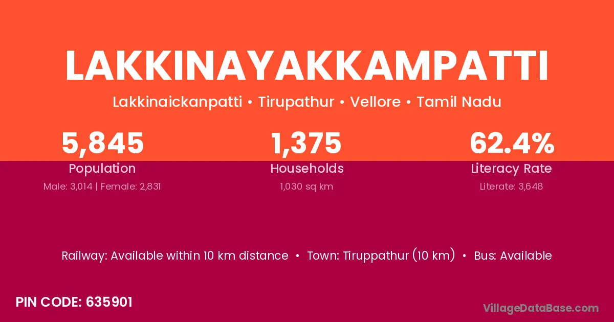 Tiruppathur (10 km) is the nearest town to Lakkinayakkampatti village for major economic activities and is located approximately 10 km away.