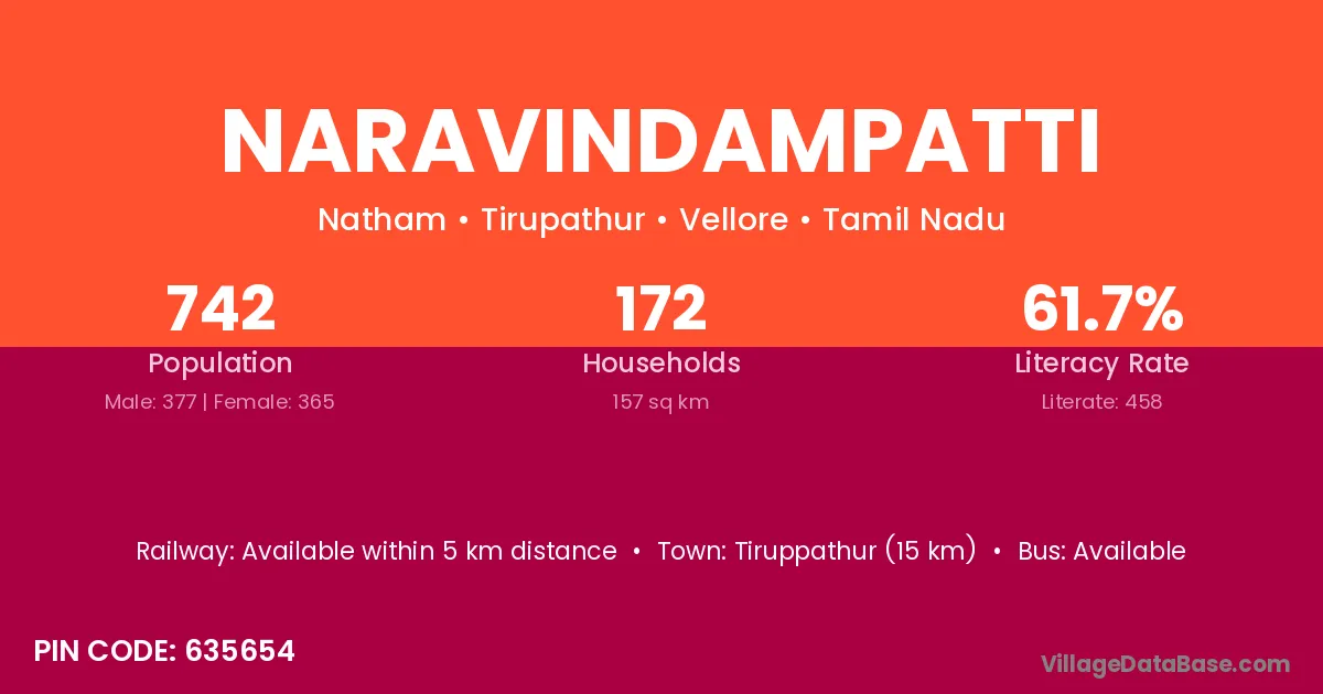 Tiruppathur (15 km) is the nearest town to Naravindampatti village for major economic activities and is located approximately 15 km away.