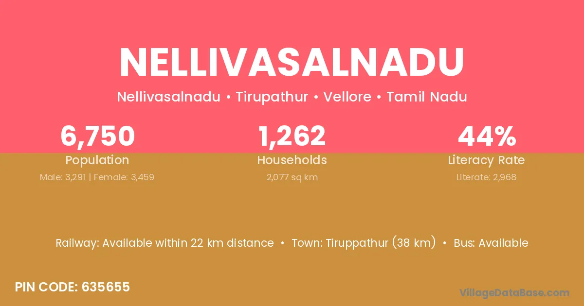 Tiruppathur (38 km) is the nearest town to Nellivasalnadu village for major economic activities and is located approximately 38 km away.