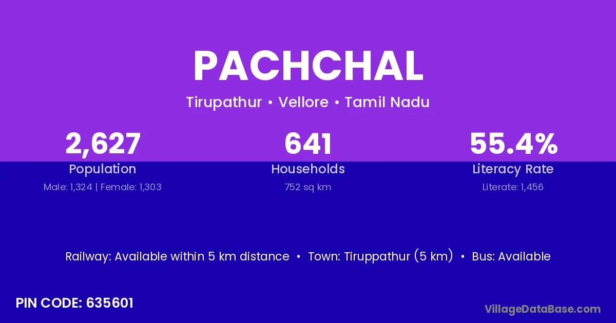 Tiruppathur (5 km) is the nearest town to Pachchal village for major economic activities and is located approximately 5 km away.