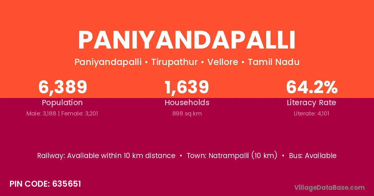 Paniyandapalli village has a total population of 6,389 people, of which 3,188 are males and 3,201 are females.