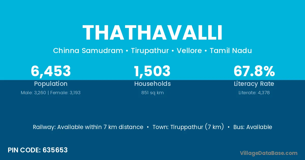 Tiruppathur (7 km) is the nearest town to Thathavalli village for major economic activities and is located approximately 7 km away.