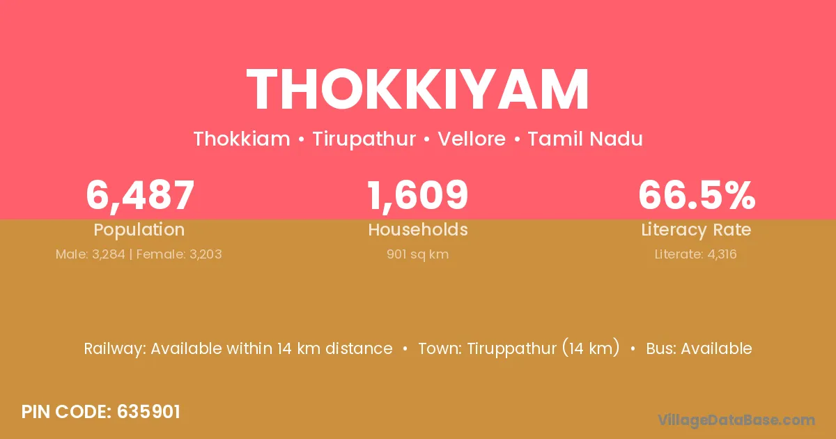 Tiruppathur (14 km) is the nearest town to Thokkiyam village for major economic activities and is located approximately 14 km away.