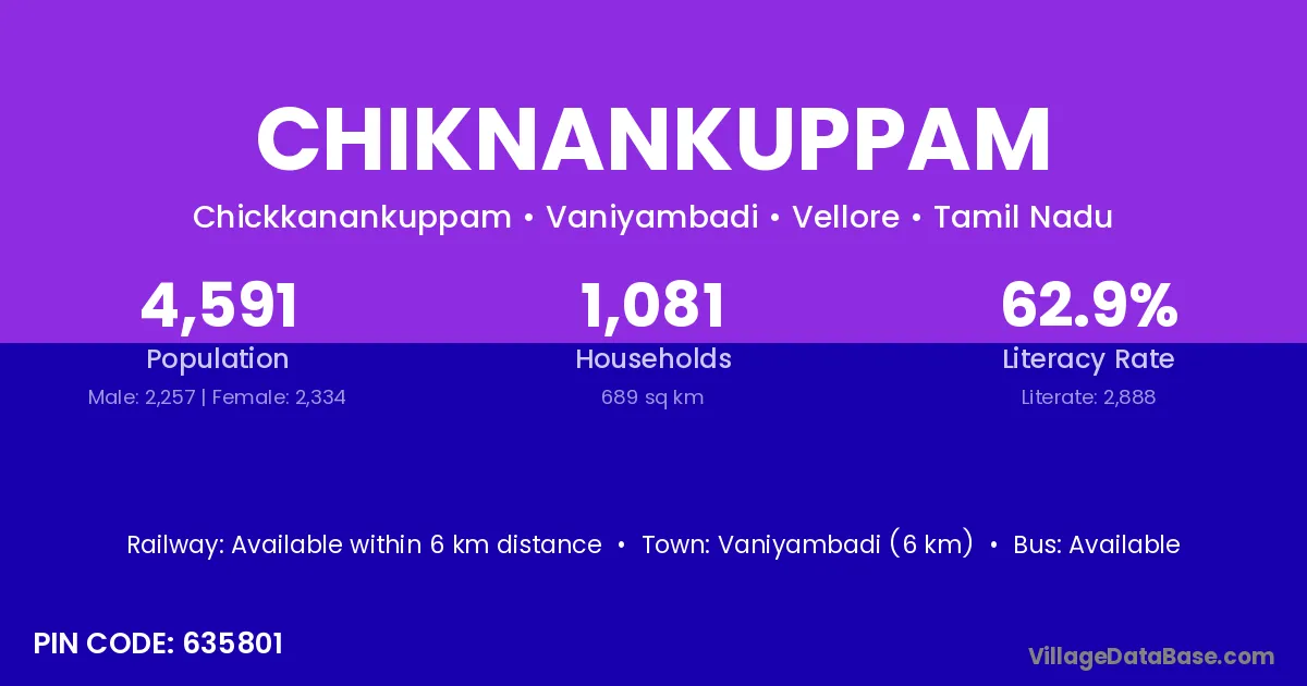 Vaniyambadi (6 km) is the nearest town to Chiknankuppam village for major economic activities and is located approximately 6 km away.