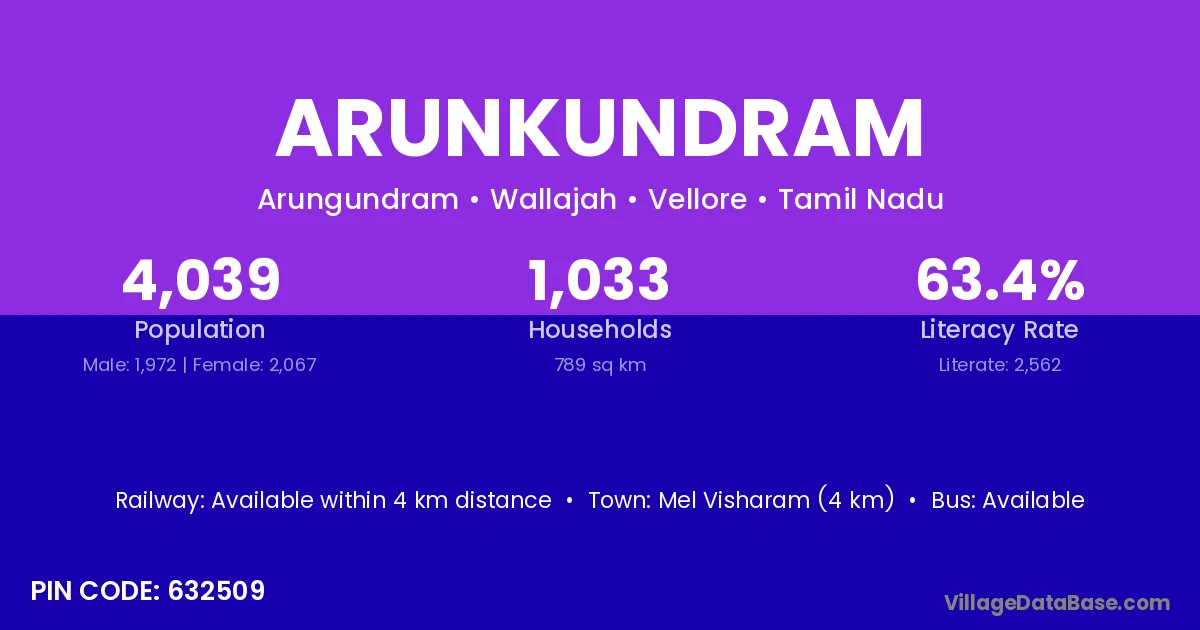 Mel Visharam (4 km) is the nearest town to Arunkundram village for major economic activities and is located approximately 4 km away.