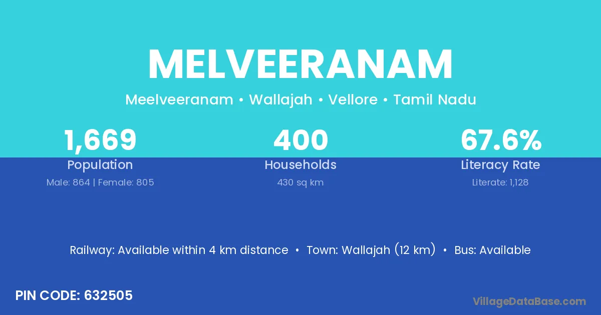 Wallajah (12 km) is the nearest town to Melveeranam village for major economic activities and is located approximately 12 km away.