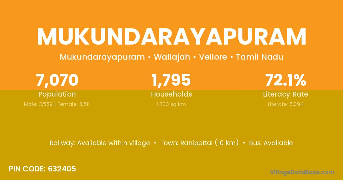 Ranipettai (10 km) is the nearest town to Mukundarayapuram village for major economic activities and is located approximately 10 km away.