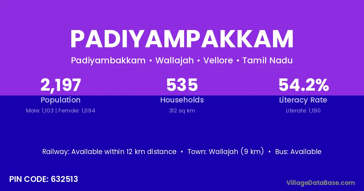 Wallajah (9 km) is the nearest town to Padiyampakkam village for major economic activities and is located approximately 9 km away.
