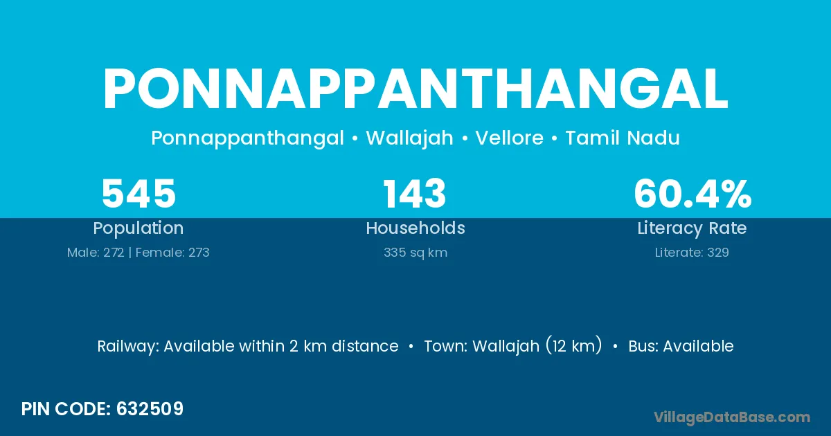 Ponnappanthangal village has a total population of 545 people, of which 272 are males and 273 are females.
