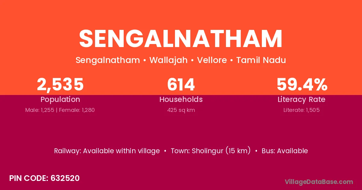 Sengalnatham village has a total population of 2,535 people, of which 1,255 are males and 1,280 are females.