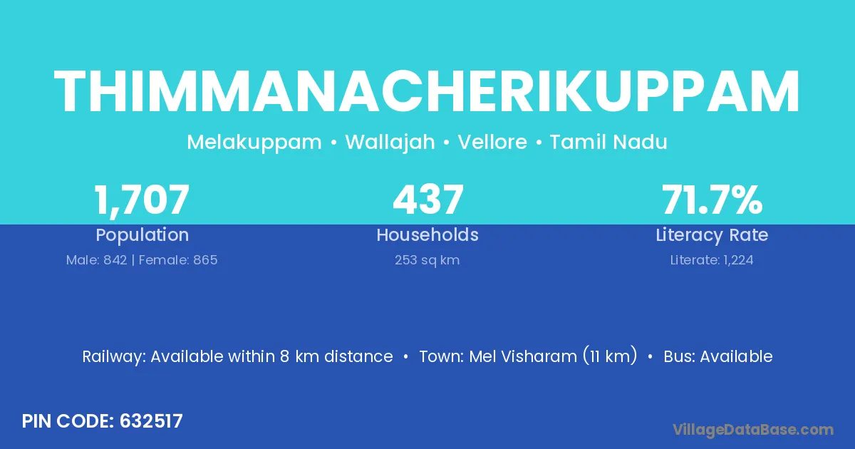 Mel Visharam (11 km) is the nearest town to Thimmanacherikuppam village for major economic activities and is located approximately 11 km away.