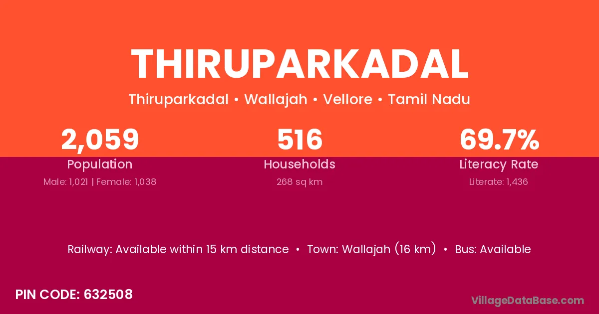 Wallajah (16 km) is the nearest town to Thiruparkadal village for major economic activities and is located approximately 16 km away.