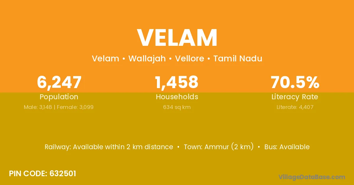 Ammur (2 km) is the nearest town to Velam village for major economic activities and is located approximately 2 km away.
