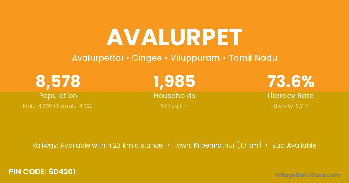 According to Census 2011 information, the village code of Avalurpet village is 604201.