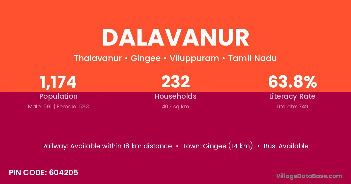 Gingee (14 km) is the nearest town to Dalavanur village for major economic activities and is located approximately 14 km away.