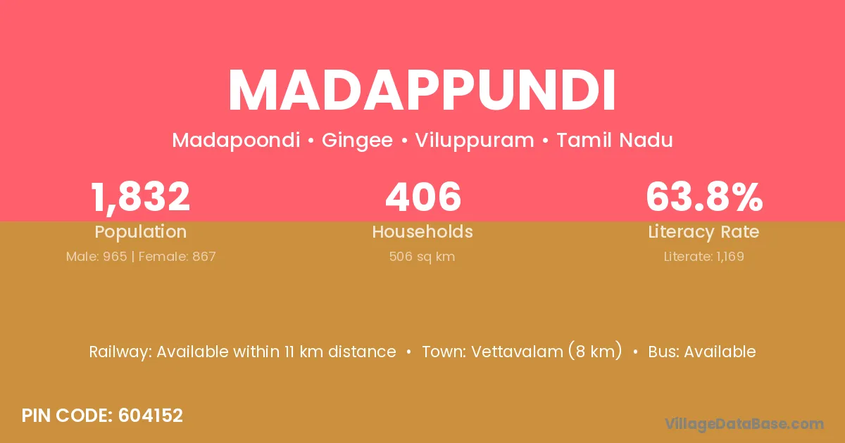 Vettavalam (8 km) is the nearest town to Madappundi village for major economic activities and is located approximately 8 km away.