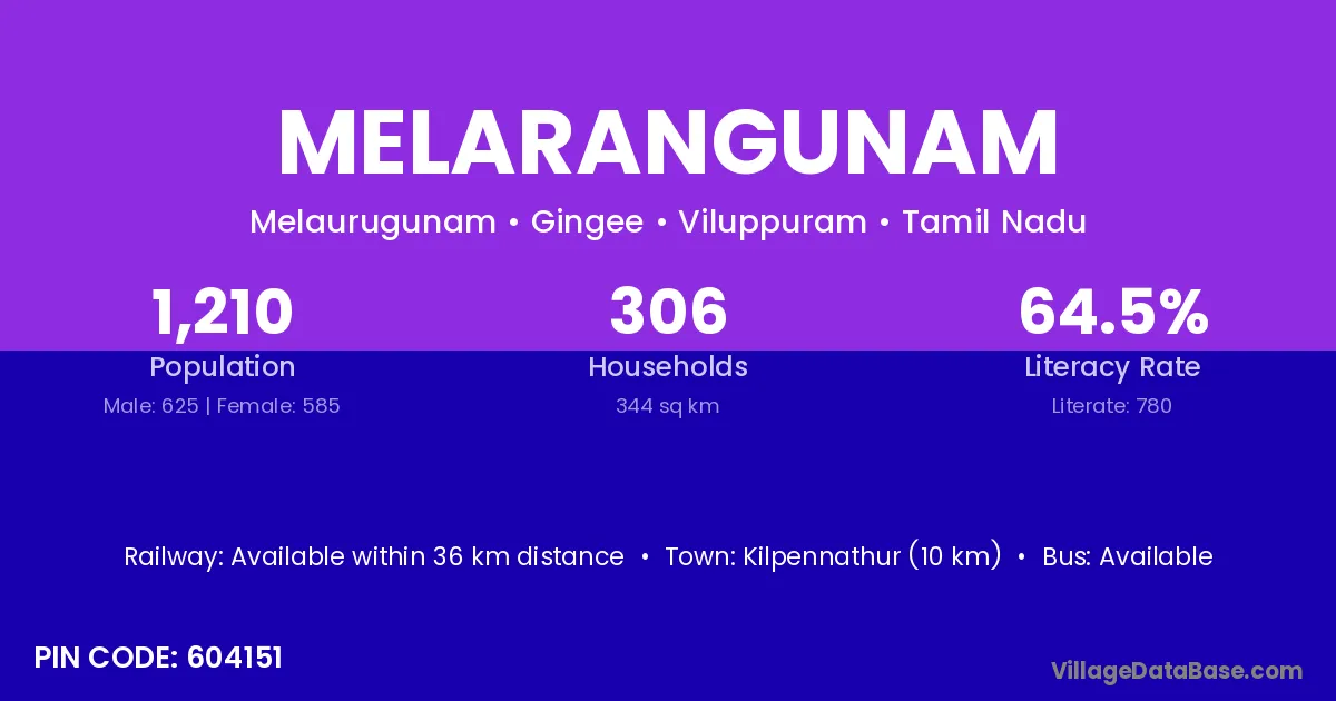 Melarangunam village has a total population of 1,210 people, of which 625 are males and 585 are females.