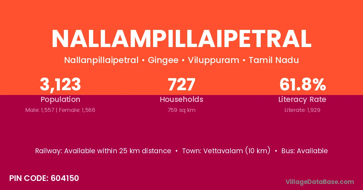 Vettavalam (10 km) is the nearest town to Nallampillaipetral village for major economic activities and is located approximately 10 km away.