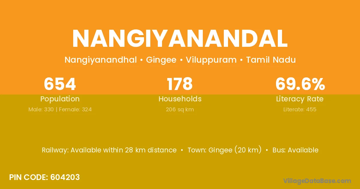 Gingee (20 km) is the nearest town to Nangiyanandal village for major economic activities and is located approximately 20 km away.