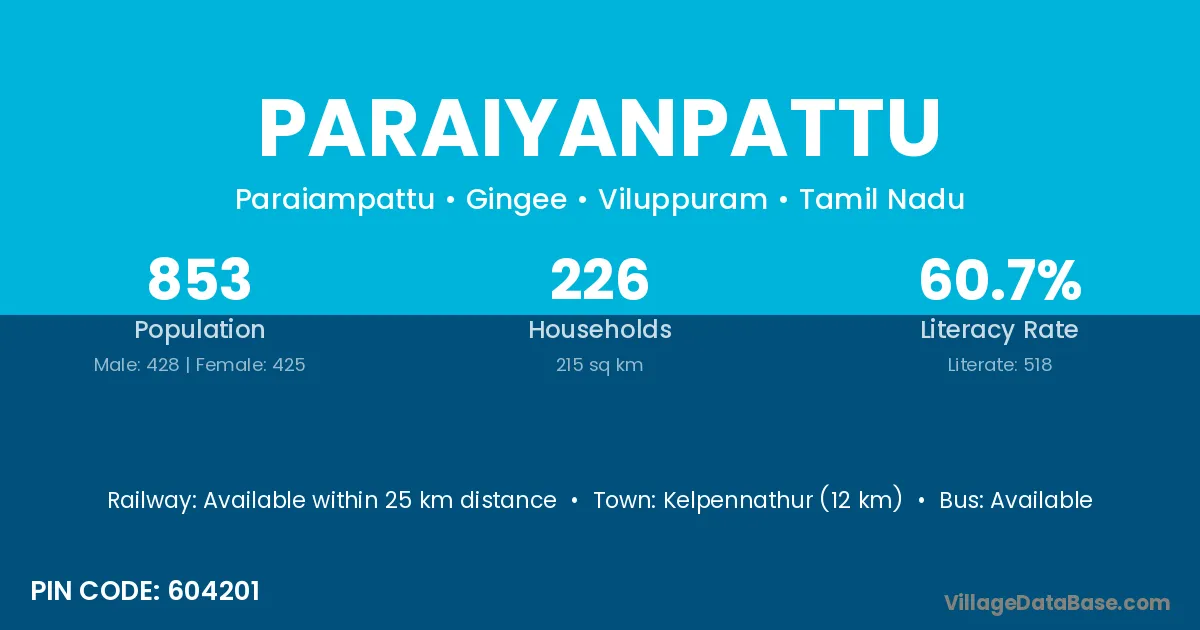 Paraiyanpattu village has a total population of 853 people, of which 428 are males and 425 are females.