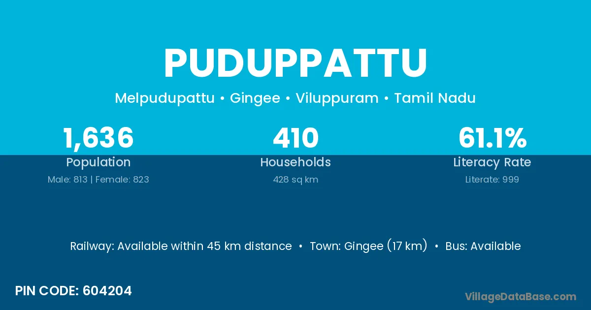 Gingee (17 km) is the nearest town to Puduppattu village for major economic activities and is located approximately 17 km away.