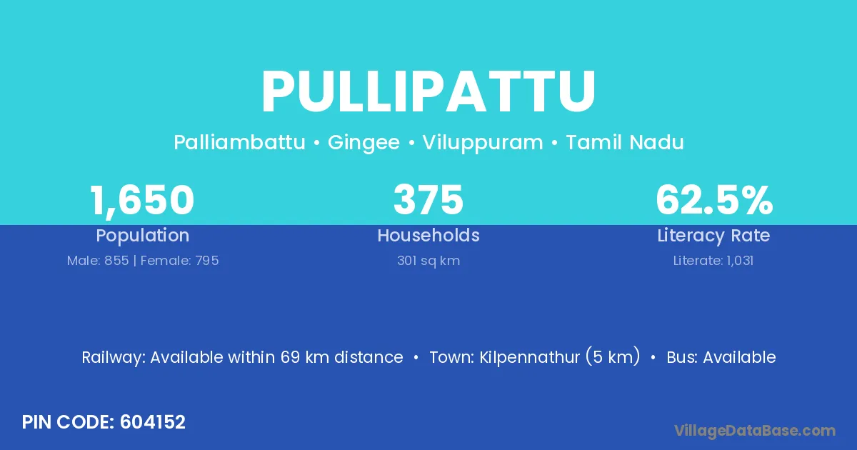Pullipattu village has a total population of 1,650 people, of which 855 are males and 795 are females.