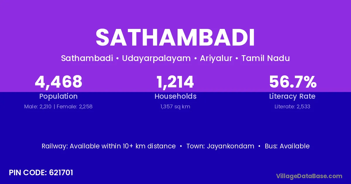 Sathambadi village has a total population of 2,379 people, of which 1,185 are males and 1,194 are females.