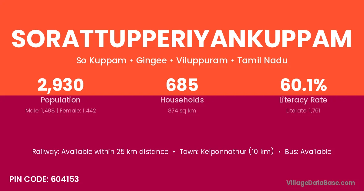 Sorattupperiyankuppam village has a total population of 2,930 people, of which 1,488 are males and 1,442 are females.