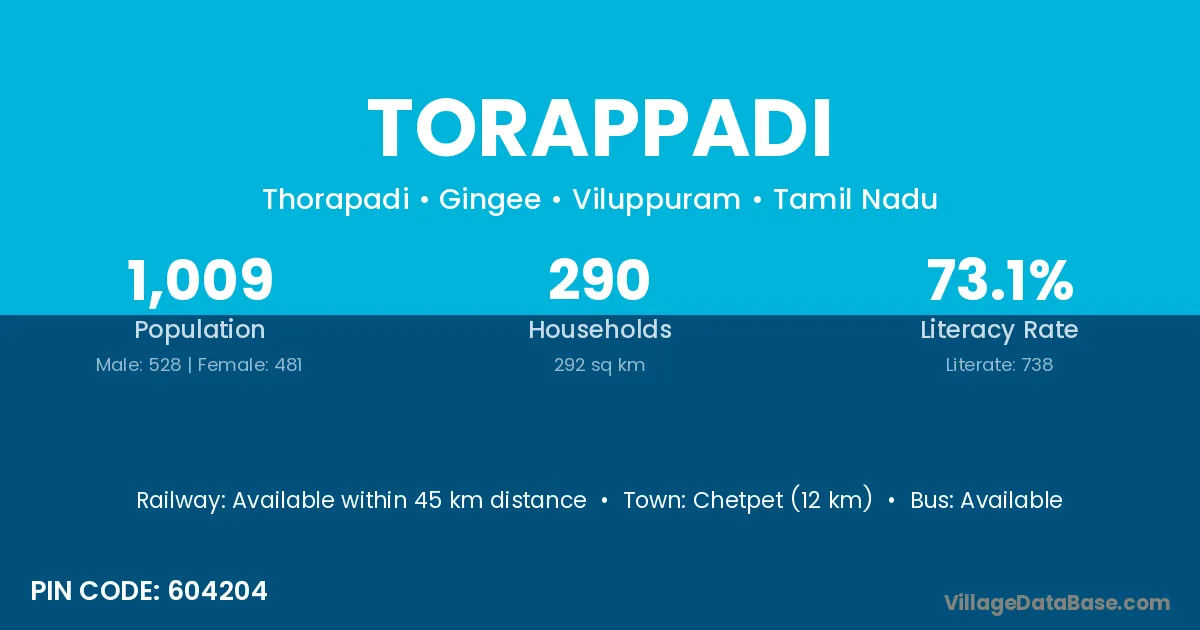 Torappadi village has a total population of 1,009 people, of which 528 are males and 481 are females.