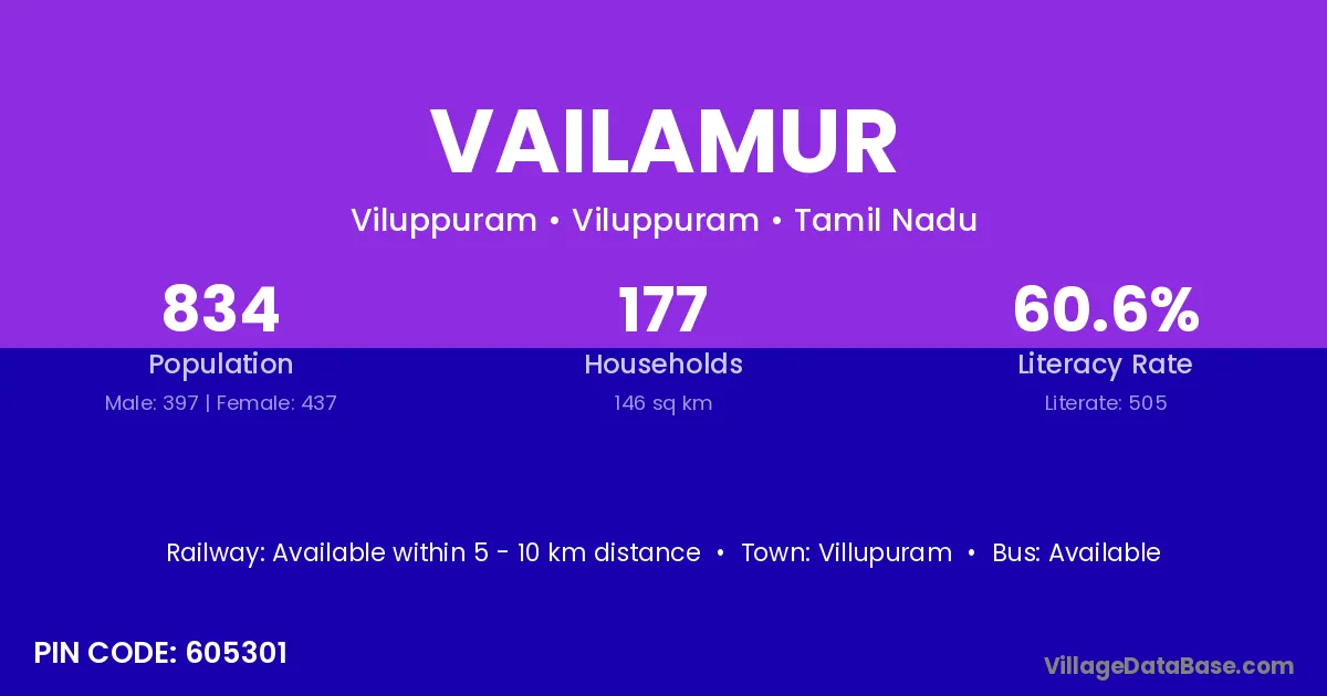 According to Census 2011 information, the village code of Vailamur village is 604201.