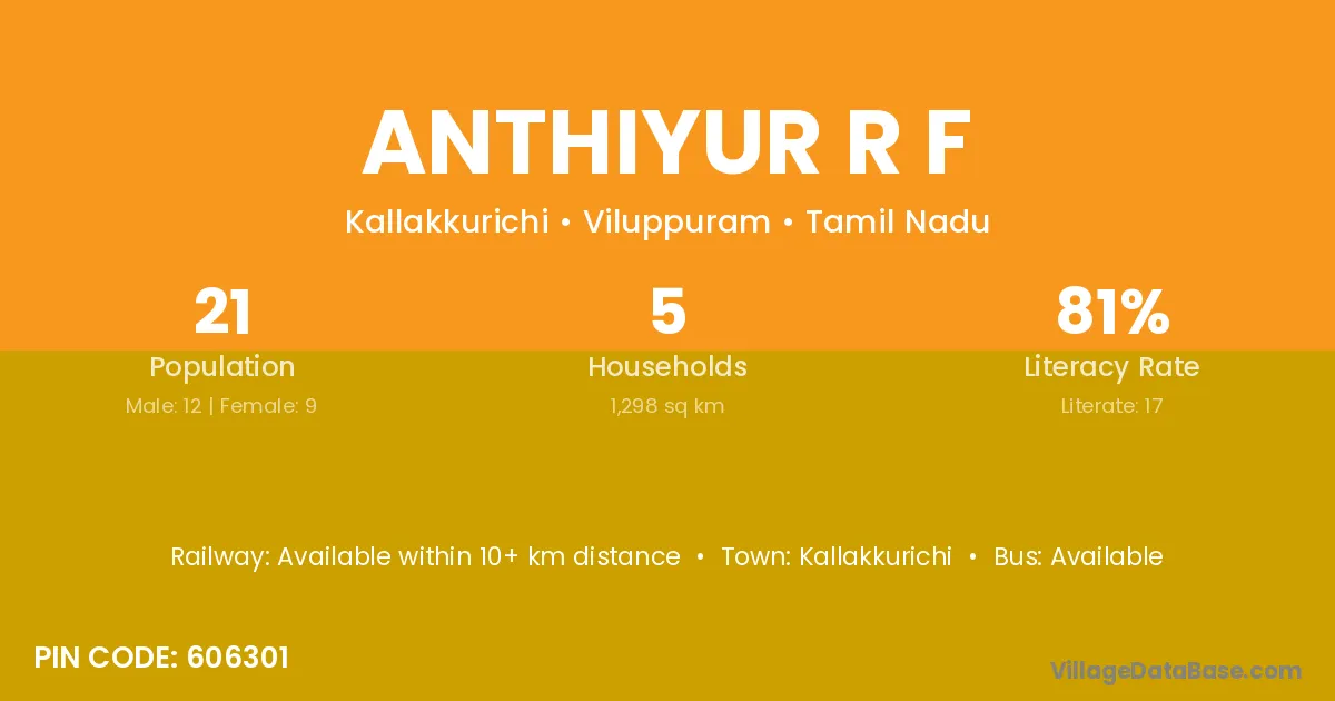 Anthiyur R F village has a total population of 21 people, of which 12 are males and 9 are females.