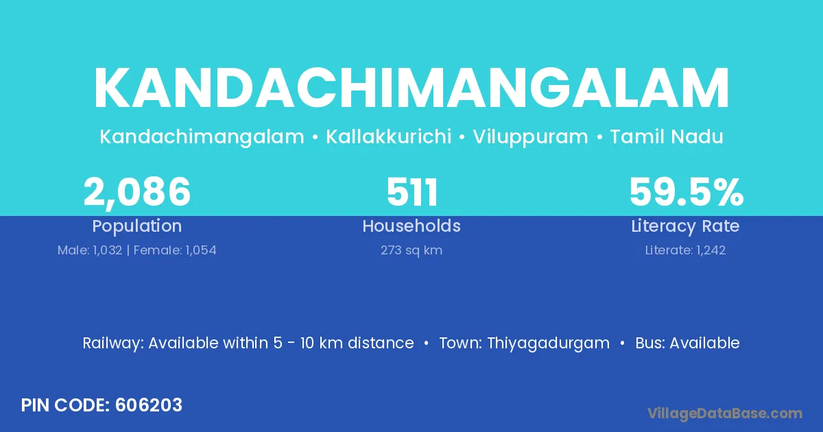 Kandachimangalam village has a total population of 2,086 people, of which 1,032 are males and 1,054 are females.