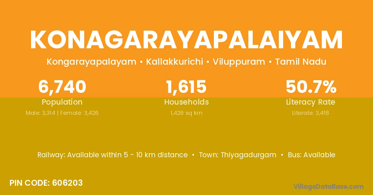 Konagarayapalaiyam village has a total population of 6,740 people, of which 3,314 are males and 3,426 are females.