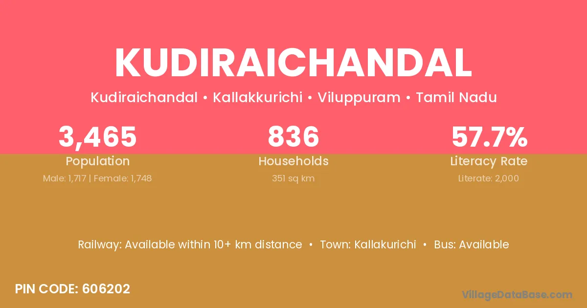 Kudiraichandal village has a total population of 3,465 people, of which 1,717 are males and 1,748 are females.