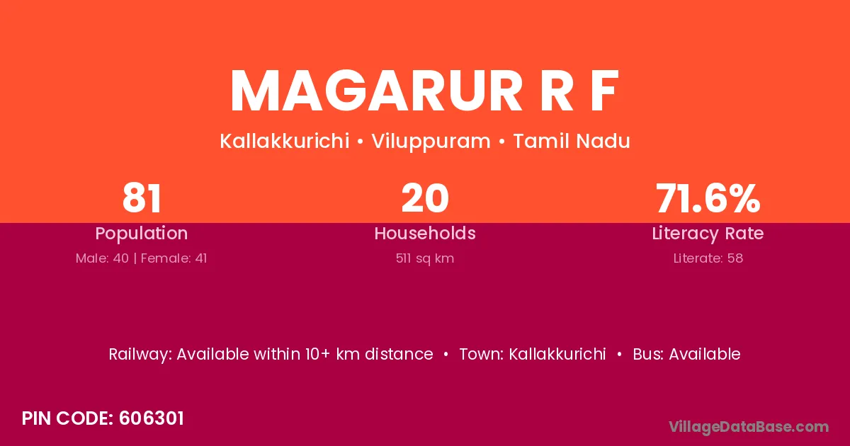Magarur R F village has a total population of 81 people, of which 40 are males and 41 are females.