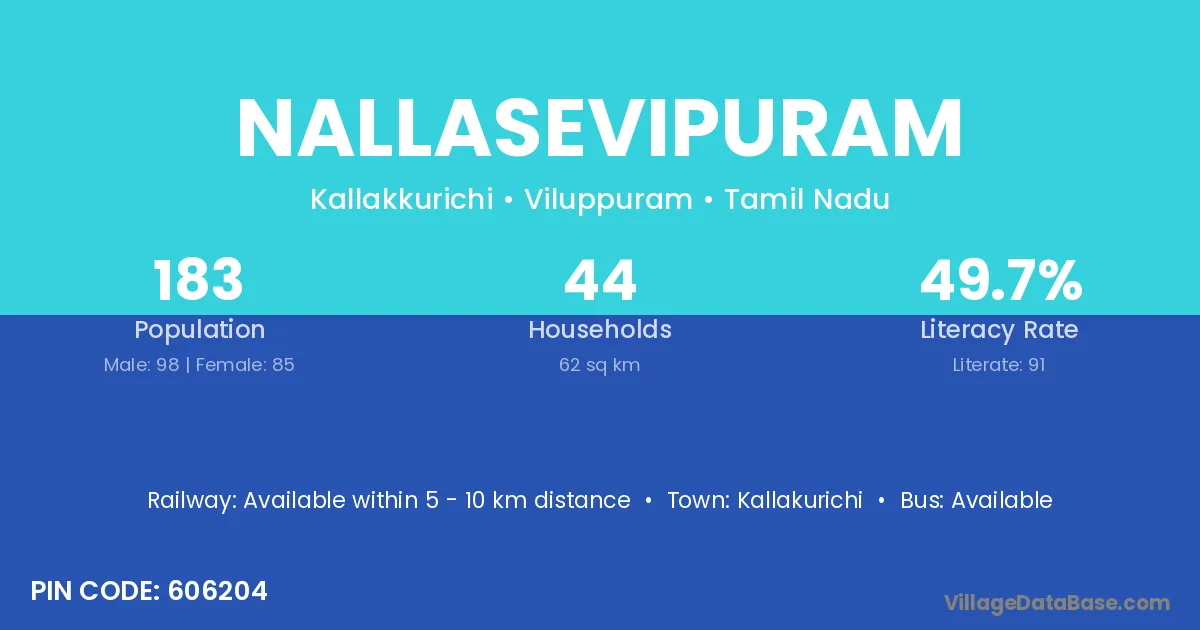 Nallasevipuram village has a total population of 183 people, of which 98 are males and 85 are females.
